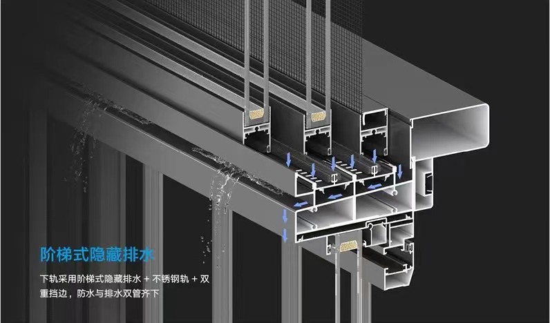 隱藏式排水: 精心設計的隱藏式排水系統,悄無聲息地排除窗框積水,有效避免雨水滲漏,進一步提升門窗的防潮屏障。